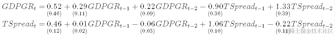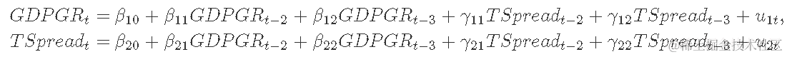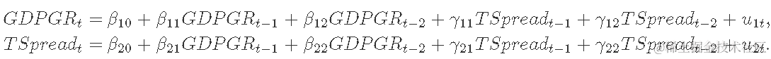 例如,为了获得对 GDP 增长和期限利差的提前两个季度的预测,我们首先估计方程