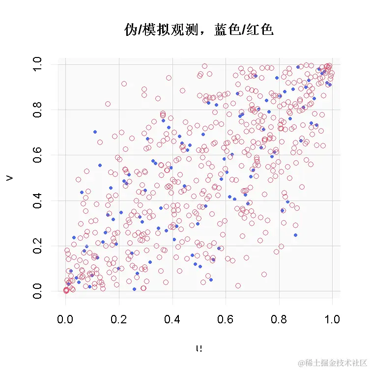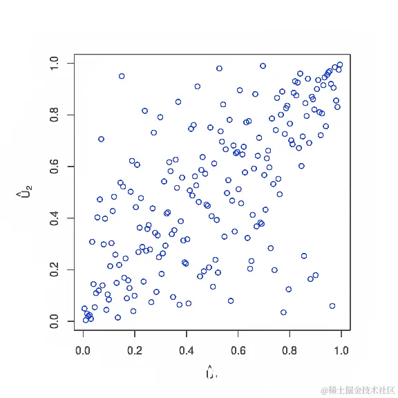 请注意,数据必须通过函数pobs()输入,该函数将真实观测值转换为单位平方[0,1]的伪观测值。