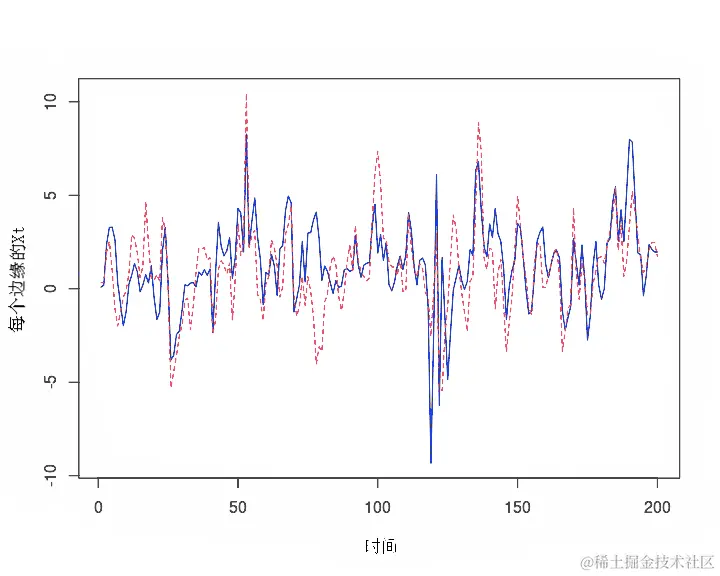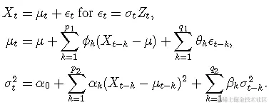 现在我们使用依赖于 copula 来模拟两个 ARMA(1,1)-GARCH(1,1) 过程。 ARMA(p1,q1)-GARCH(p2,q2) 模型由下式给出