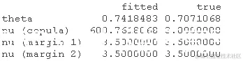 将 t copula 拟合到标准化残差 Z。对于边缘分布,我们还假设 t分布,但具有不同的自由度;为简单起见,此处省略了估计。