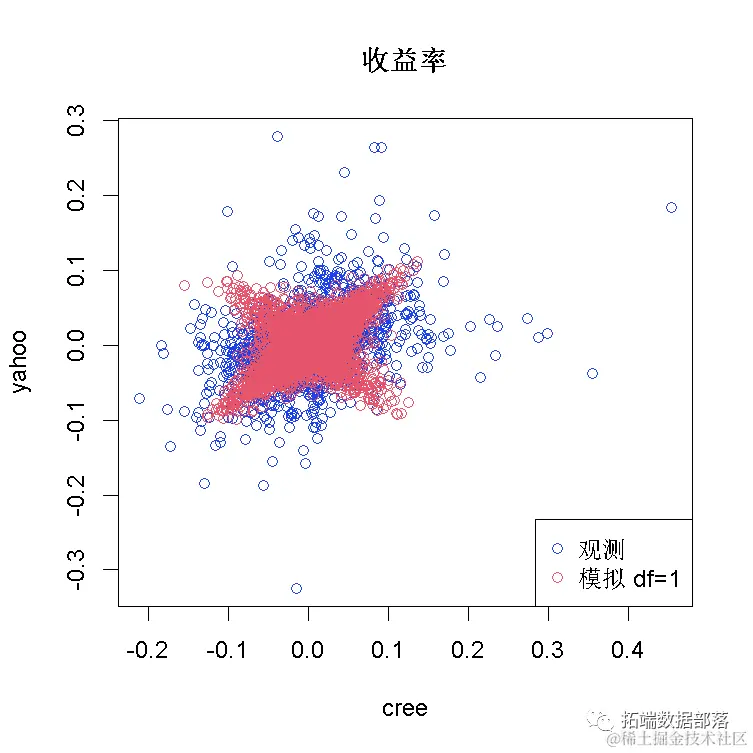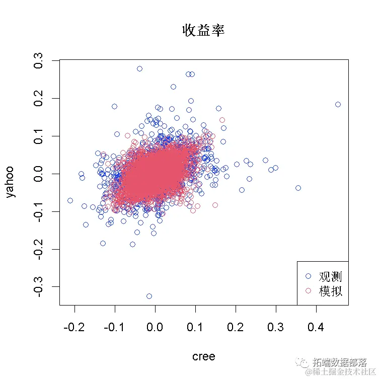 这是在假设正态分布边缘和相依结构的t-copula的情况下数据的最终散点图: