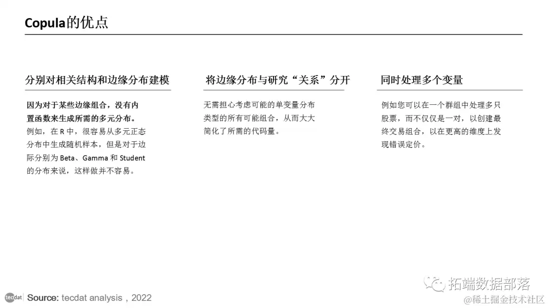 今天,copulas 被用于高级财务分析,以更好地理解涉及厚尾和偏度的结果。用于帮助识别市场风险、信用风险和操作风险。它依赖于两种或多种资产收益的相互依赖关系。相关性最适合 正态分布,而金融市场中的分布本质上通常是非正态分布。因此,copula 已应用于诸如期权定价和投资组合风险价值等金融领域,以处理偏斜或不对称分布。