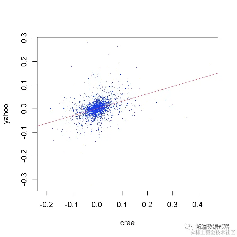在直接进入copula拟合过程之前,让我们检查两个股票收益之间的相关性并绘制回归线: