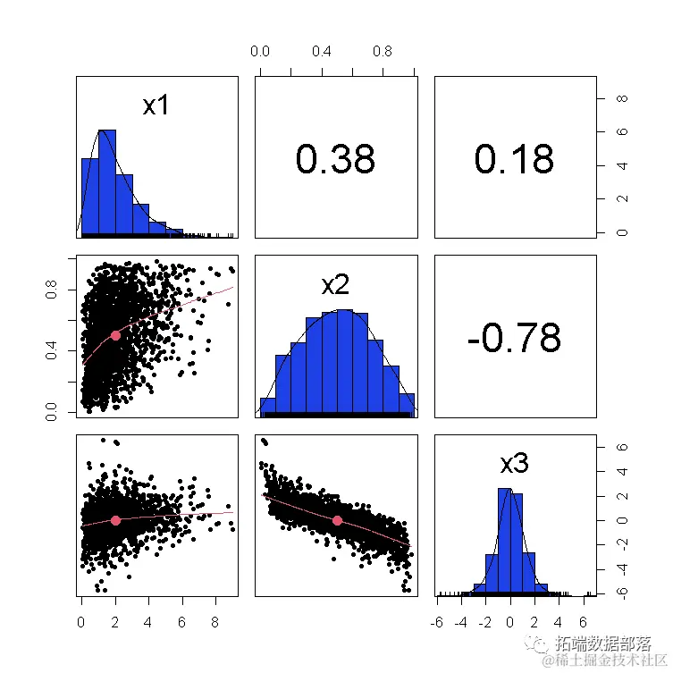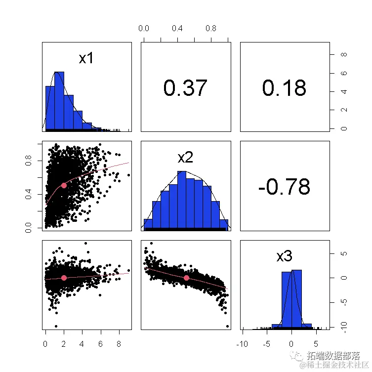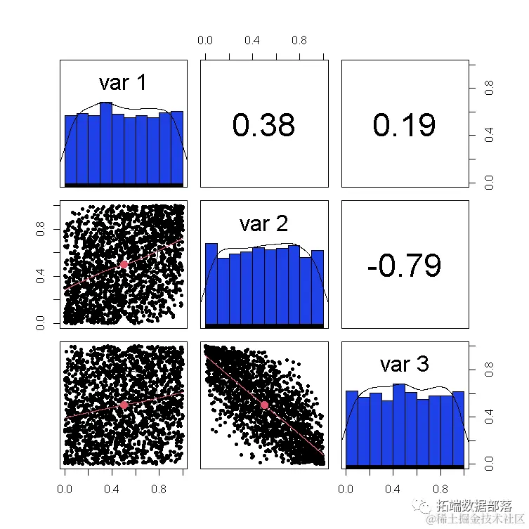 现在我们已经通过copula(普通copula)指定了相依结构并设置了边缘,mvdc()函数生成了所需的分布。然后我们可以使用rmvdc()函数生成随机样本。