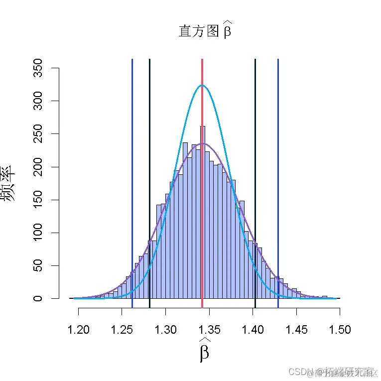 那就是摩根士丹利 与市场。估计值以 1.87 为中心。黑色垂直线是“lm”函数报告的 (95%) 置信区间,蓝色垂直线是等效的非参数置信区间,浅蓝色曲线是正态密度。