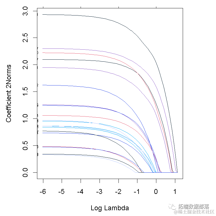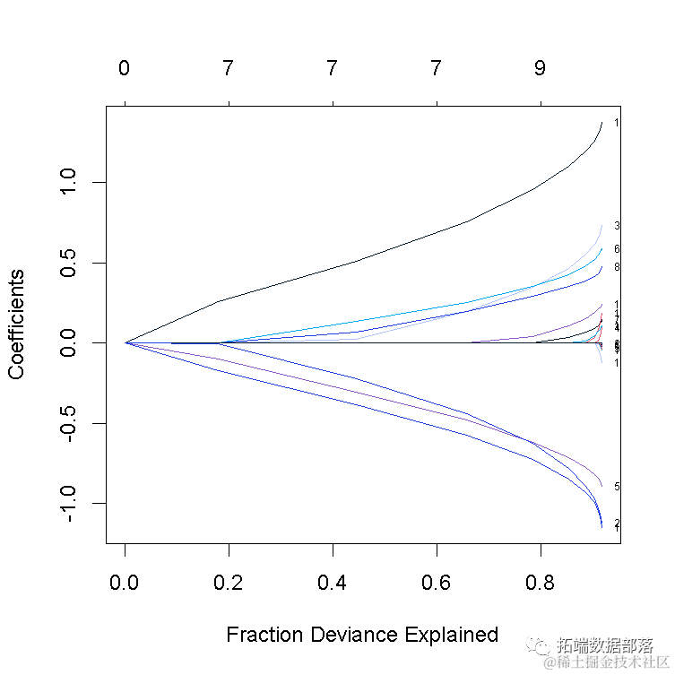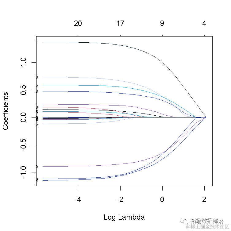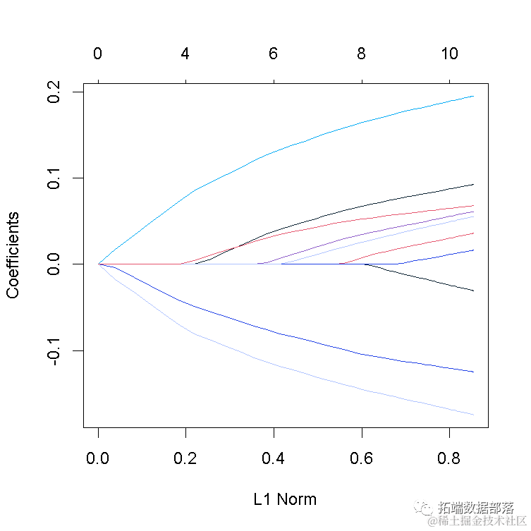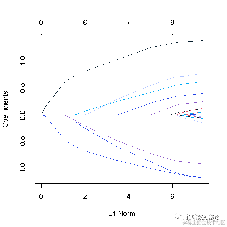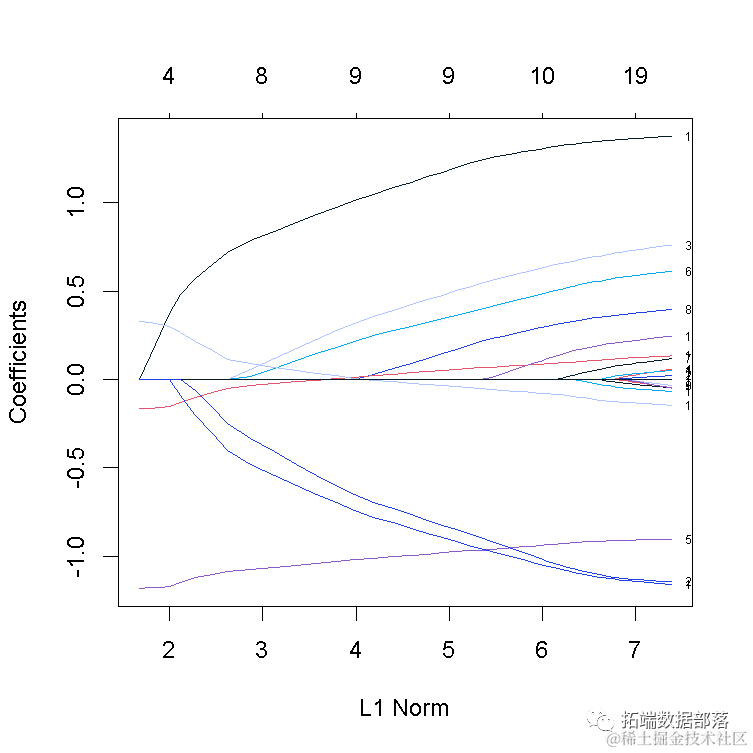 每条曲线对应一个变量。它显示了当λ变化时,其系数相对于整个系数向量的ℓ1范数的路径。上方的轴表示当前λ处非零系数的数量,这是套索的有效自由度(_df_)。用户可能还希望对曲线进行注释。这可以通过label = TRUE 在plot命令中进行设置来完成 。