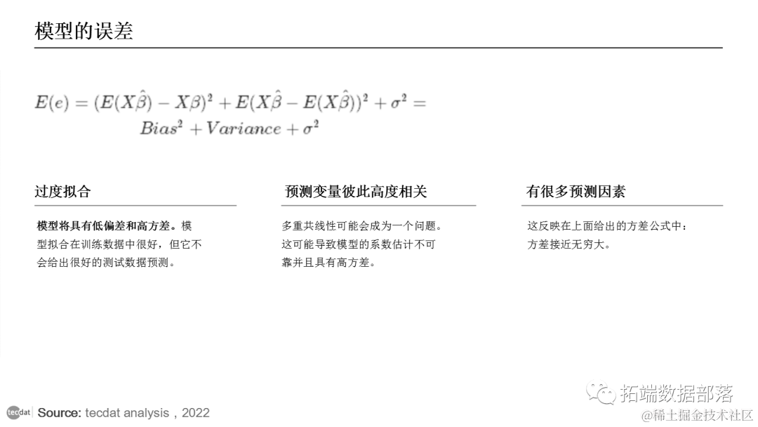 事实上,模型的误差可以分解为三个部分:大方差导致的误差、显著偏差导致的误差以及剩下的——无法解释的部分。