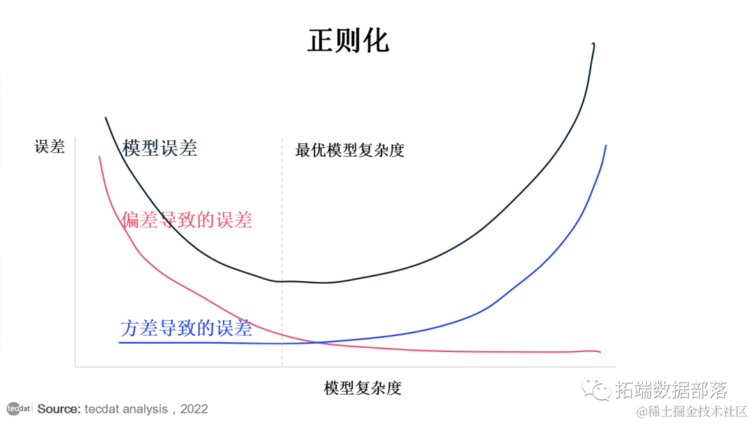 随着模型复杂性的增加(也就是在线性回归的情况下可以被认为是预测变量的数量),估计的方差也会增加,但偏差会减少。无偏的 OLS 会将我们置于图片的右侧,这远非最优。这就是我们进行正则化的原因:最小化变量的数量,降低模型的复杂度的同时,以一些偏差为代价来降低方差,从而在图上向左移动,向最优方向移动。