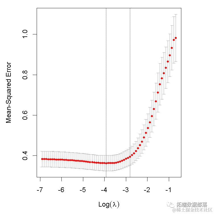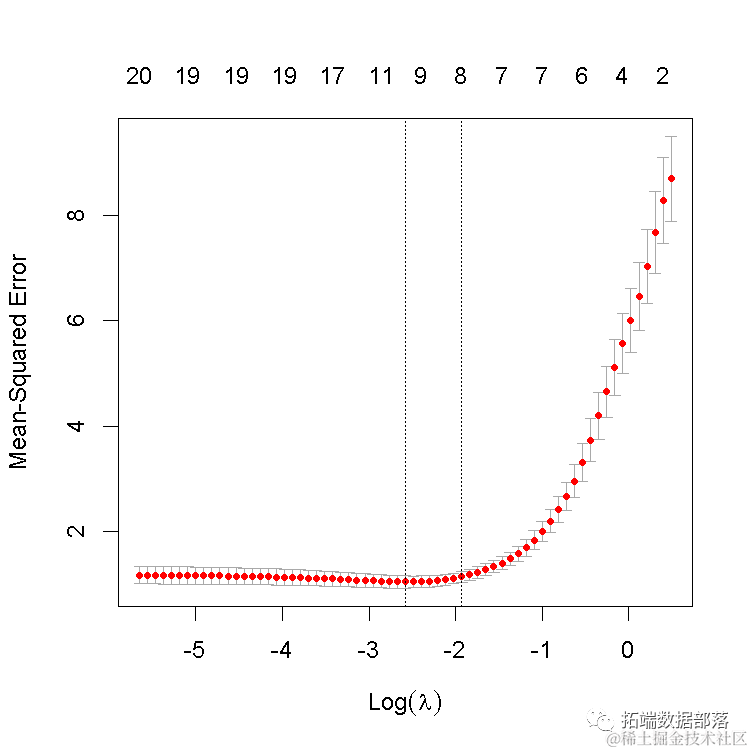 如前所述,图中的左垂直线向我们显示了CV误差曲线达到最小值的位置。右边的垂直线向我们展示了正则化的模型,其CV误差在最小值的1个标准偏差之内。我们还提取了最优λ。