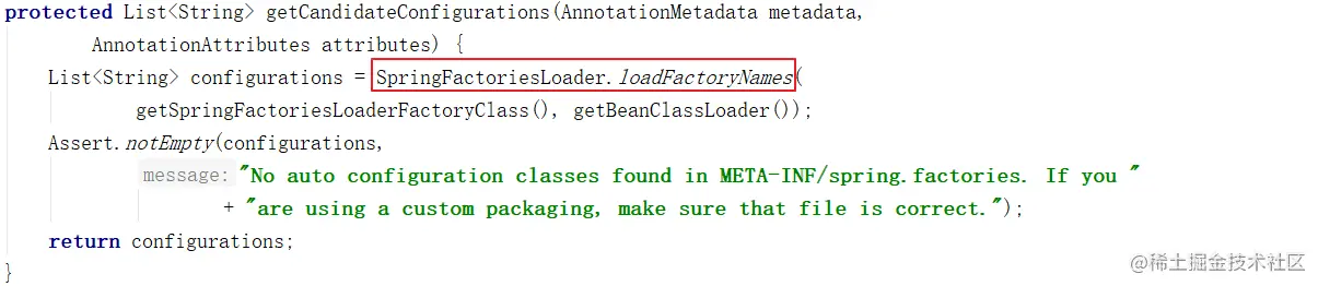 AutoConfigurationImportSelector类的getCandidateConfigurations方法中的调用了SpringFactoriesLoader类的loadFactoryNames方法,继续跟踪源码: