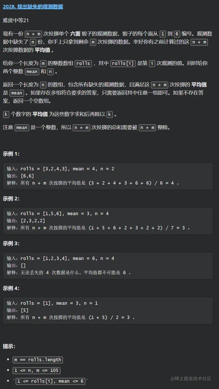本次刷题日记的第 12 篇,力扣题为:2028. 找出缺失的观测数据赛 ,中等