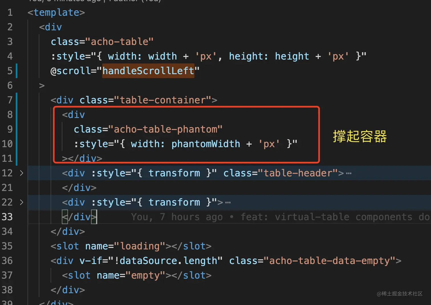 上面有个bug,直接在table-container里面设置了width是不对的,而是要创建一个acho-table-phantom虚拟 div,把它的宽度设置成总宽度,用来撑起整个 div,生成滚动条。