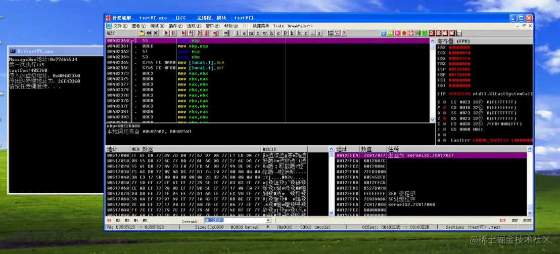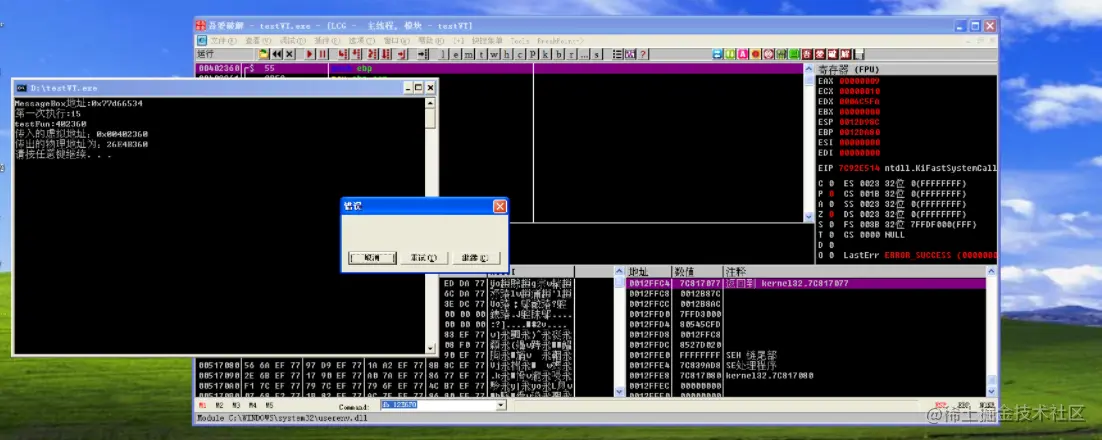 此时虽然内存展示是原本函数,但是执行的却是弹出了MessageBox(由于push的type类型是0,xp上面显示的就是这个样子)。