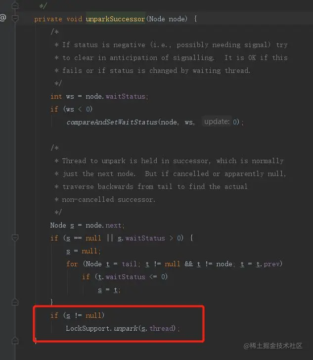 接下来就会走unparkSuccessor方法,successor代表继承者的意思,见名知意,这个方法其实就会唤醒当前线程中离头节点最近的没有状态为非取消的线程。然后调用LockSupport.unpark,唤醒等待的线