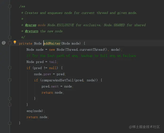 接下来就会走到addWaiter方法,这个方法很重要,就是将当前线程封装成一个Node,然后将这个Node放入双向链表中。addWaiter先根据指定模式创建指定的node节点,因为ReentrantLock是独占模式,所以传进去的EXCLUSIVE,这里通过当前线程和模式传入,初始化一个双向node节点,获取最后一个节点,根据最后一个节点是否存在来操作当前节点的父级。如果尾节点不存在会去调用enq去初始化