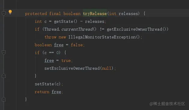 其实很简单,就是判断锁的状态,也就是加了几次锁,然后减去释放的,最后判断释放之后,锁的状态是不是0(因为可能线程加了多次锁,所以得判断一下),是的话说明当前这个锁已经释放完了,然后将占有锁的线程设置为null,然后返回true,
