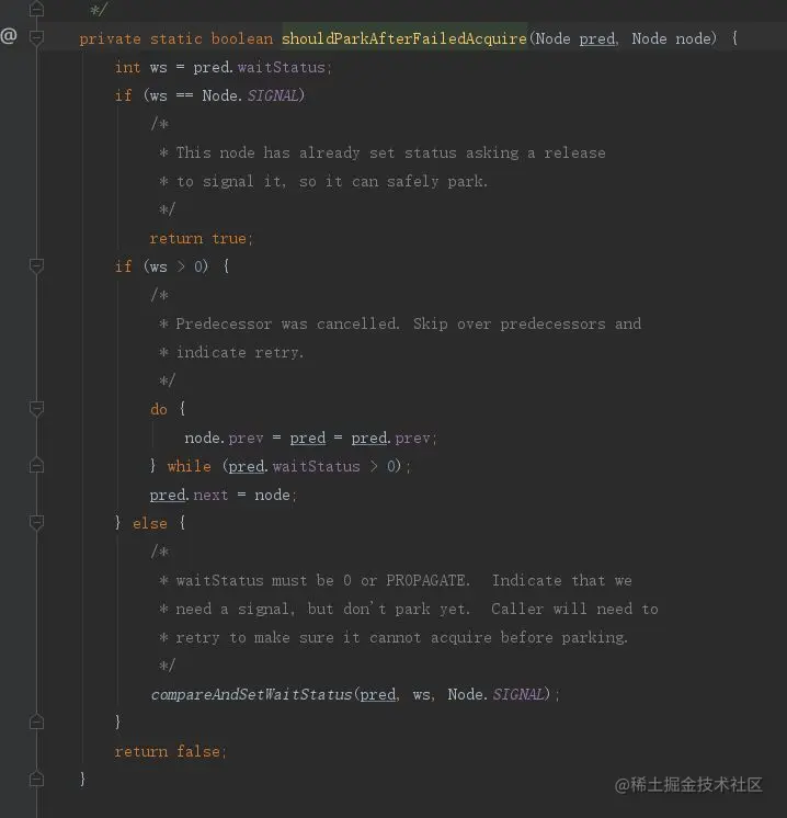 线程2进来的时候,刚好线程2的前一个节点是头节点,但是不巧的是调用tryAcquire方法,还是失败,那么此时就会走shouldParkAfterFailedAcquire方法,这个方法是在线程休眠之前调用的,很重要,我们来看看干了什么事。