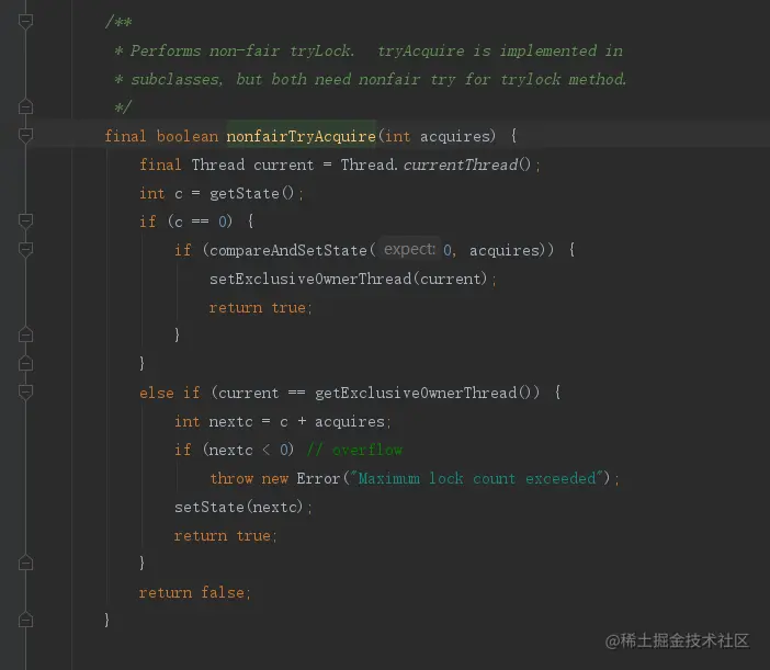 先获取锁的状态,判断锁的状态是不是等于0,等于0说明没人加锁,可以尝试去加,如果被加锁了,就会走else if,else if会判断加锁的线程是不是当前线程,是的话就给state 加 1,代表当前线程加了2次锁,就是可重入锁的意思(所谓的可重入就是代表一个线程可以多次获取到锁,只是将state 设置为多次,当线程多次释放锁之后,将state 设置为0才代表当前线程完全释放了锁)。