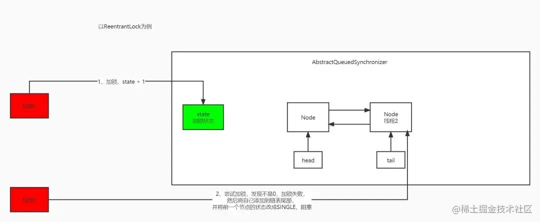 线程1先过来,发现没人加锁,那么此时就会加上锁。此时线程2过来,在线程2加锁的过程中,线程1始终没有释放锁,那么线程2就不会加锁成功(如果在线程2加锁的过程中线程1始终释放锁,那么线程2就会加锁成功),线程2没有加锁成功,就会将自己当前线程加入等待队列中(如果没有队列就先初始化一个),然后设置前一个节点的状态,最后通过LockSupport.park方法,将自己这个线程休眠。