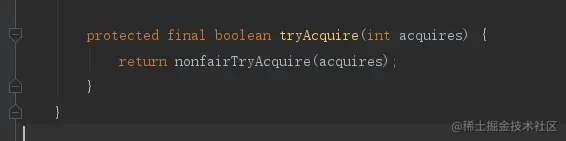 进入到acquire会先调用tryAcquire再次尝试加锁,而这个tryAcquire方法AQS其实是没有什么实现的,会调用到NonfairSync里面的tryAcquire,而tryAcquire实际会调用到Sync内部类里面的nonfairTryAcquire非公平尝试加锁方法。