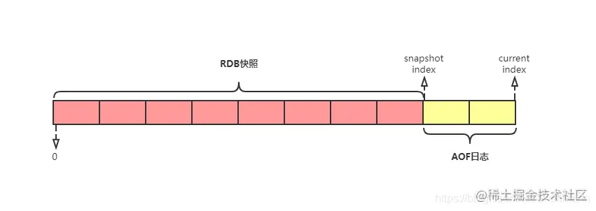 - 因为RDB快照数据和AOF日志数据都存在同一个文件中,所以该aof格式文件就不再只存放全量的AOF日志了,而是前面的大部分存储的是RDB的快照数据,后一小部分存储的是自RDB快照持久化开始到持久化结束的这段时间发生的增量AOF日志。所以通常是RDB数据占了大头,AOF日志只是一小部分的增量日志