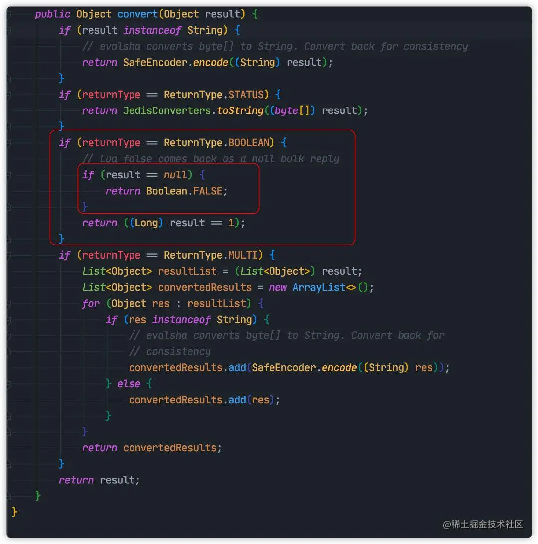 如果返回值使用 Boolean,Spring-data-redis 进行类型转换时将会把 null 转为 false,这就会影响我们逻辑判断,所以返回类型只好使用 Long。