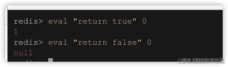 这个转化比较容易踩坑,Redis 中是不存在 boolean 类型,所以当Lua 中 true 将会转为 Redis 整数 1。而 Lua 中 false 并不是转化整数,而是转化 null 返回给客户端。