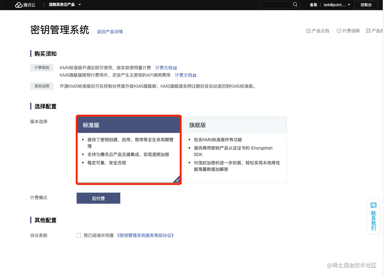 然后,我们就可以登陆控制台,创建用于签名的 RSA 非对称密钥了。腾讯云提供了标准版 & 旗舰版 KMS,旗舰版更安全,就是贵,中小项目使用标准版即可。