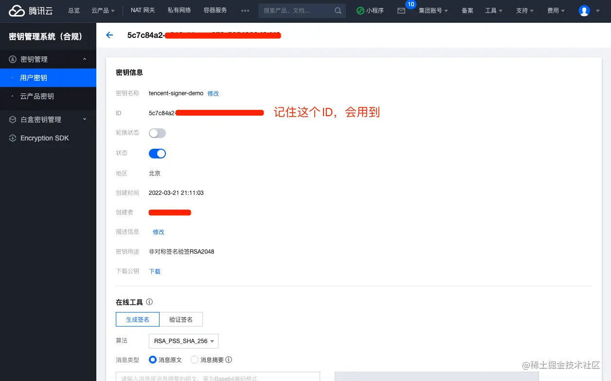 各大云厂商都提供 KMS 服务,这里我们以腾讯云 KMS 为例,做个小 Demo。