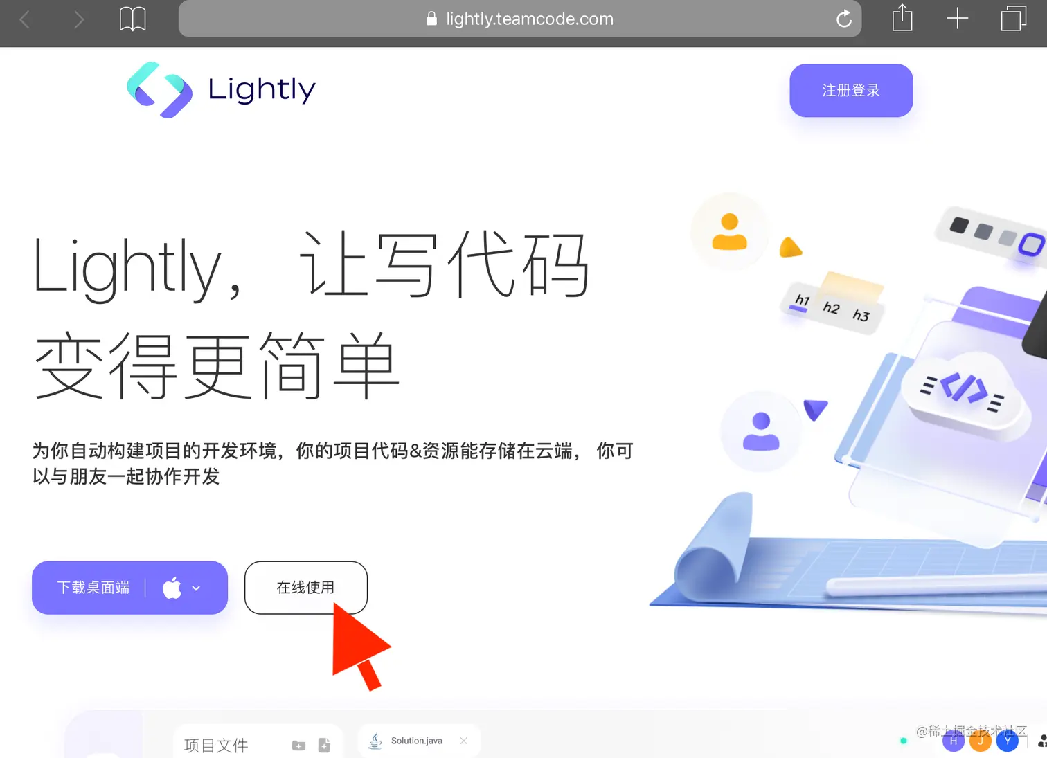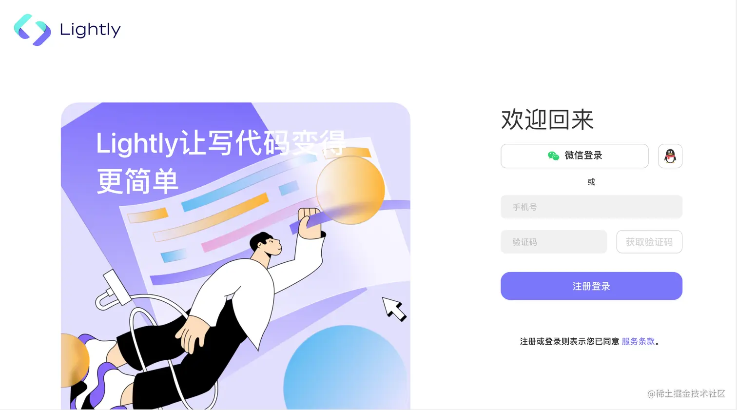 从产品介绍可以看到,Lightly是一款有云端和本地代码编辑器功能的集成开发环境,支持多种编程语言。可以在云端自动构建开发环境,实时储存编程进度,而且还支持项目的协作开发功能,用户可以将项目分享给朋友,一起写代码。我让小K将项目上传到lightly,并将链接微信发我,点击进入登陆界面。无需单独注册,用手机验证码或者微信、QQ扫码便可登陆。