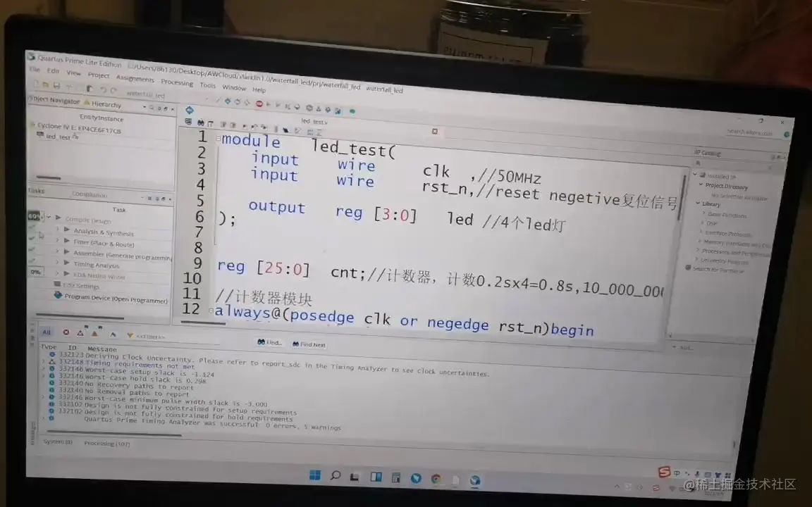 以上就是今天要讲的内容,本文介绍了流水灯的设计,在下一期课程中,将会增加按键信号,制作更为复杂的按键控制led灯。由于仿真不是本章节的重点,所以只演示仿真的过程,没有细讲,这并不代表仿真不重要。后期的作品会出一期单独讲解仿真的课程(功能仿真和时序仿真)。提醒:后期作品以实验名称命名。敬请期待,谢谢观看!