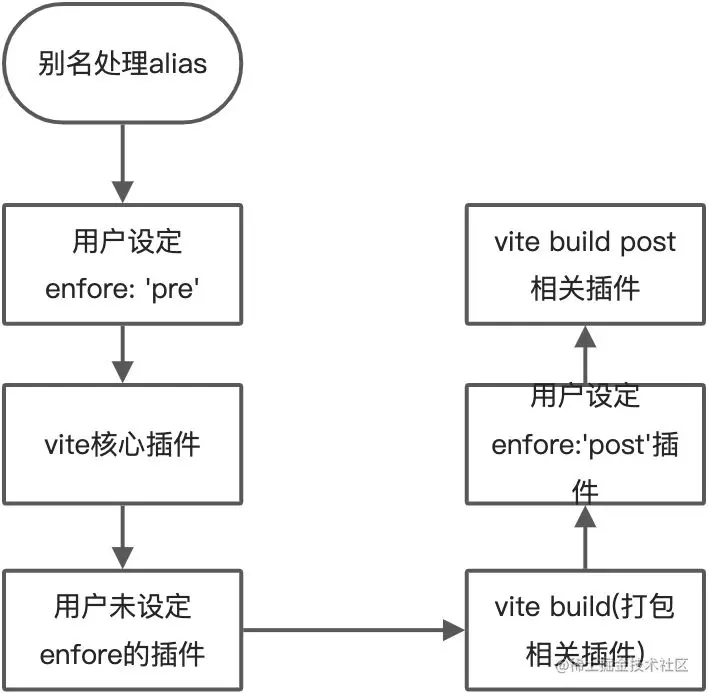 在vite插件开发的过程中,我们一般都会给插件配置enfore 插件属性,来去确定我们的产检具体在哪个位置执行;下面流程图展示一下具体插件的执行顺序: