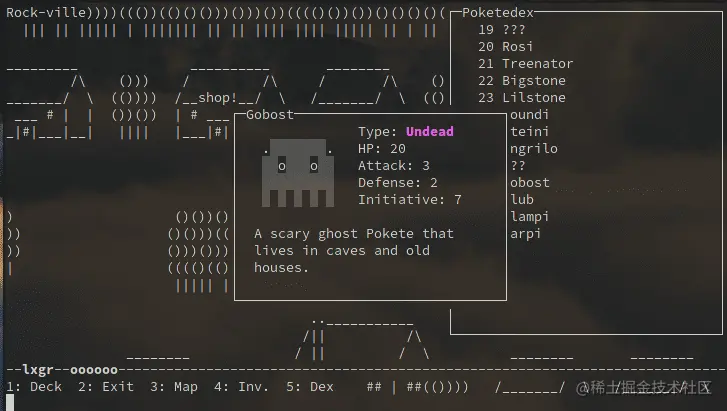 21、pokete:运行在终端里的口袋妖怪类游戏。虽然游戏图像采用简单的 ASCII 码构建,但商店、小精灵、对战等功能一应俱全