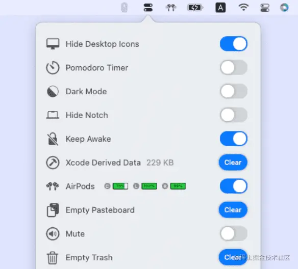 25、OnlySwitch:免费开源的 macOS 状态栏一键设置工具。可以轻松对系统功能进行设置,如隐藏桌面图标、清理 Xcode 缓存、一键隐藏刘海儿、进入夜览模式等数十种功能