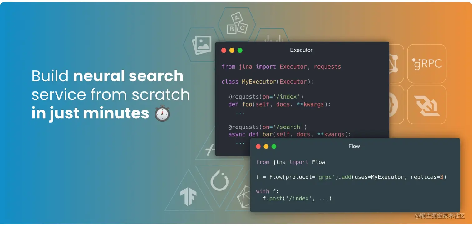 36、jina:一款易用的神经搜索框架。神经搜索是指用非结构化数据,搜索非结构化数据。Jina 简化了神经搜索系统的搭建流程,使开发者可以快速构建以图搜图、以文字搜图、问答机器人、照片去重、海量标签分类等应用