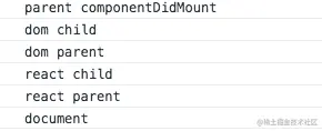 componentDidMount() { this.parent.addEventListener('click', (e) => { console.log('dom parent'); }) this.child.addEventListener('click', (e) => { console.log('dom child'); }) document.addEventListener('click', (e) => { console.log('document'); }) }