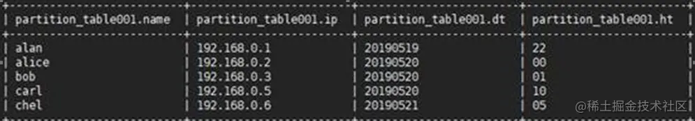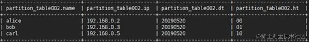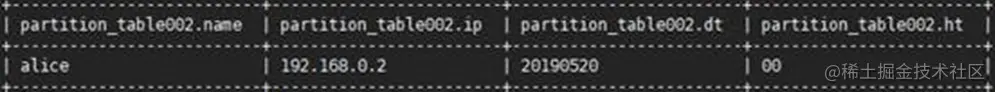 查询一下表partition_table002中我们插入的数据,结果如下图所示: