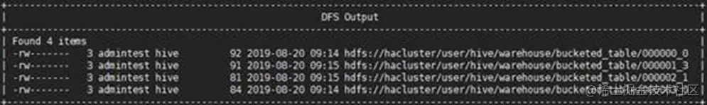 步骤 4 查看表格bucketed_table下的所有分桶信息,需要拥有admin权限的用户使用dfs –ls <表或分区存储目录>命令如下: