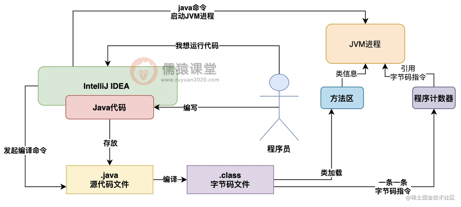 因此这个时候JVM有两个东西就可以引出来了,一个是方法区,或者现在Java新版本也可以叫做元数据区,就是这个区域是存放我们加载到内存里的类的,另外一个是程序计数器,就是这个东西是存放我们要运行的下一条字节码指令的,有人可能会说,这个字节码指令是什么?你大概可以认为,字节码指令就是我们的方法里写的代码,这些代码会转化为字节码指令,通过字节码指令运行我们的代码逻辑,如下图。