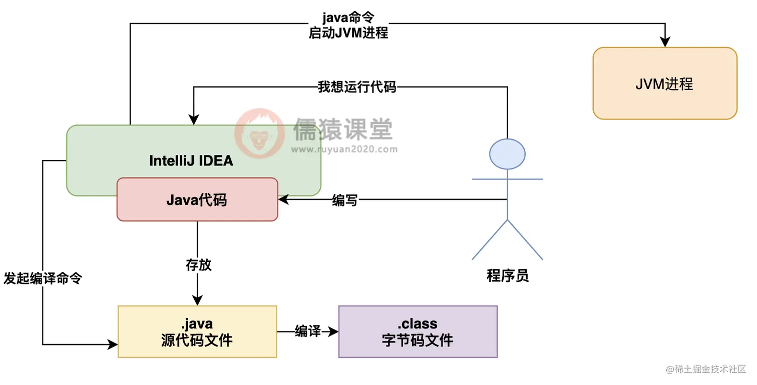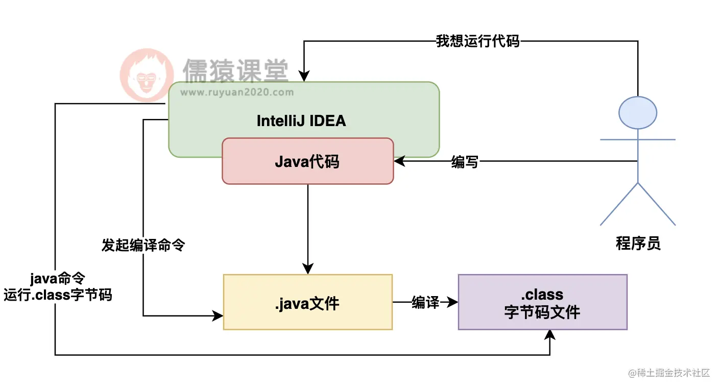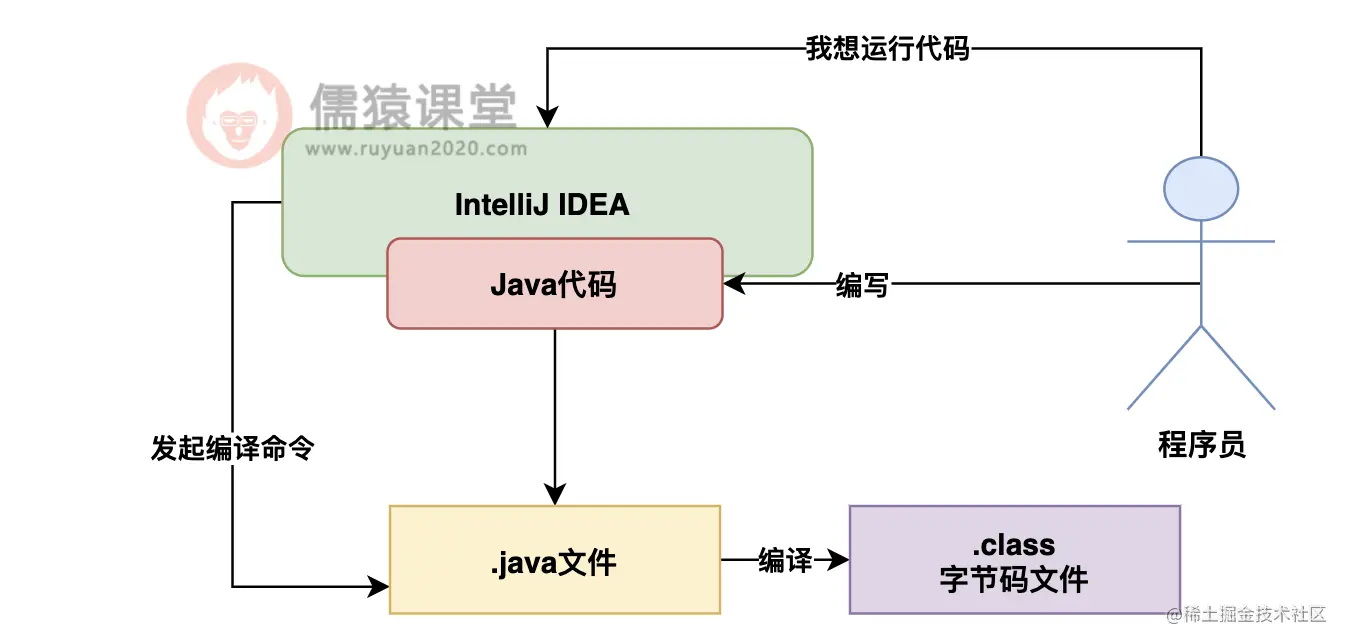 接着呢,最关键的点来了,如果你是自己要运行代码,可以在命令行里对.class字节码文件发出java命令,如果你是用Intellij IDEA的,那么你点击运行代码按钮,人家自动就给你先编译代码,然后它自己直接用java命令来运行.class字节码文件了,如下图。