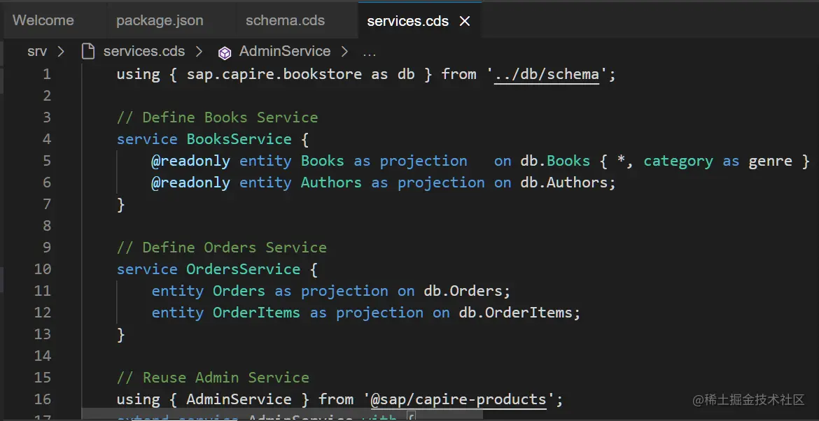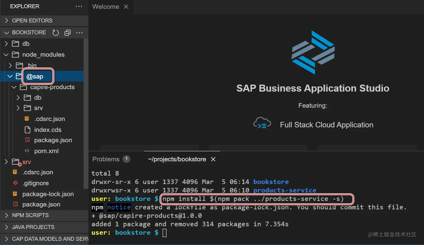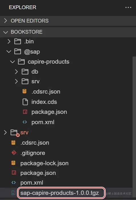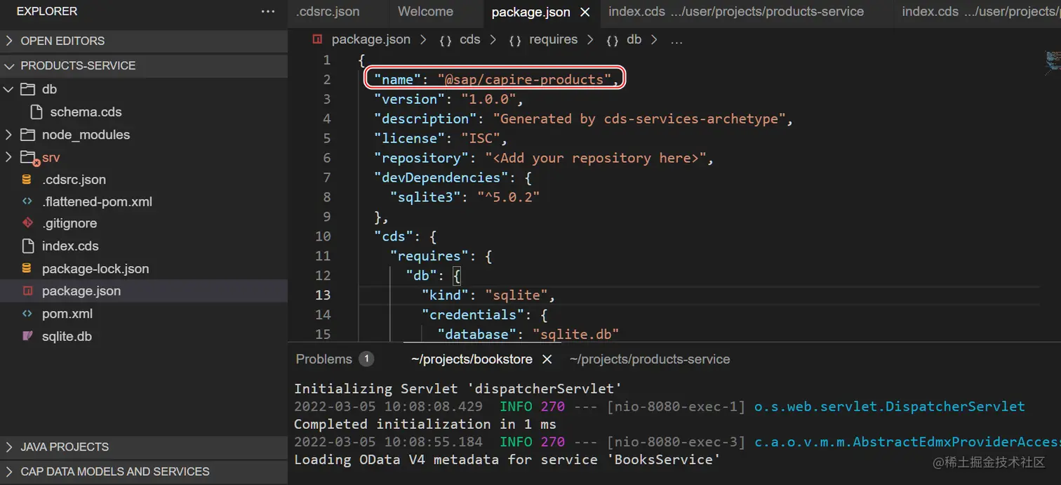 打开 products-service 项目,在 package.json 里找到其 name 的值:@sap/capire-products