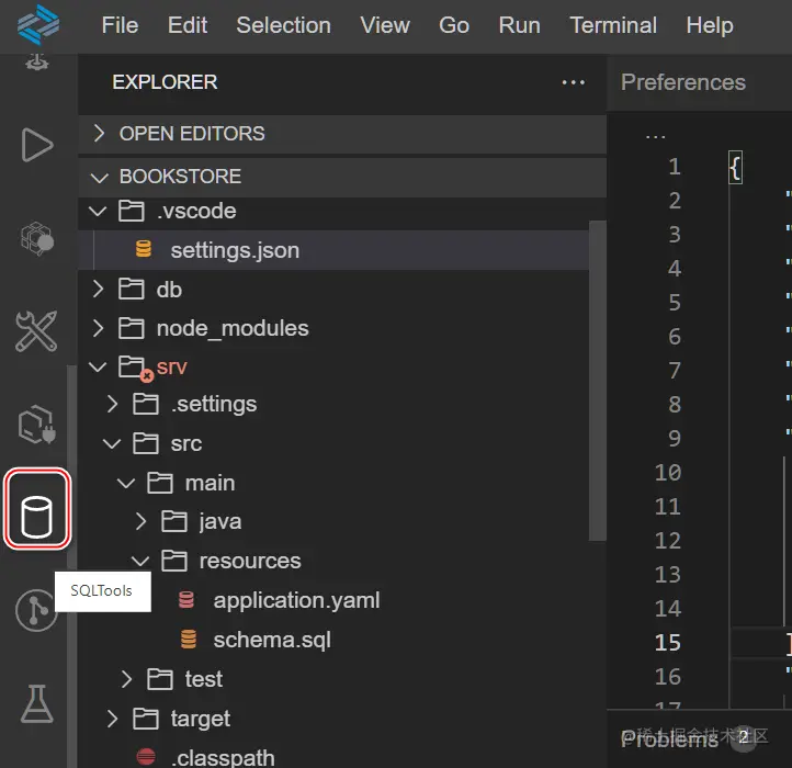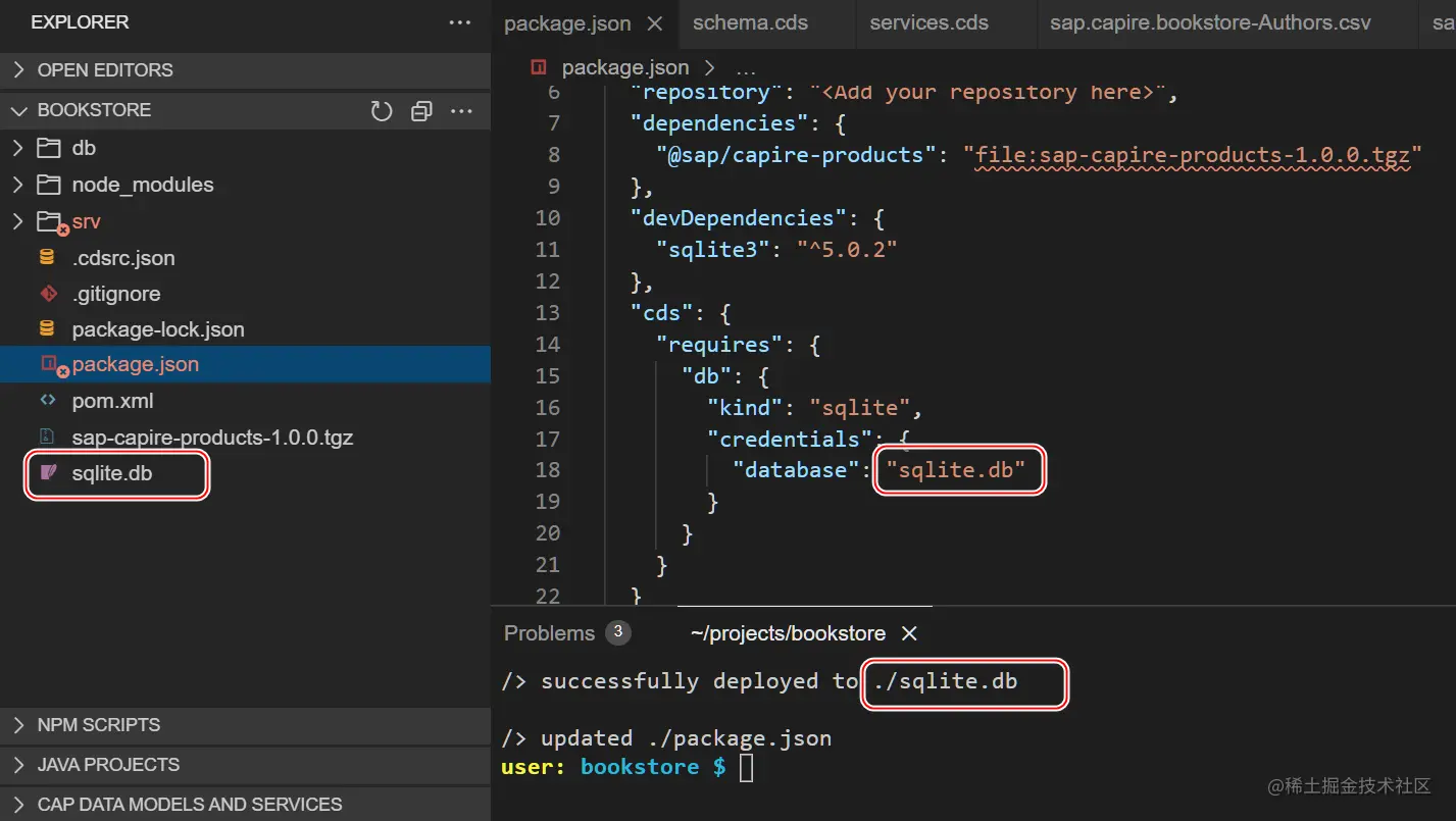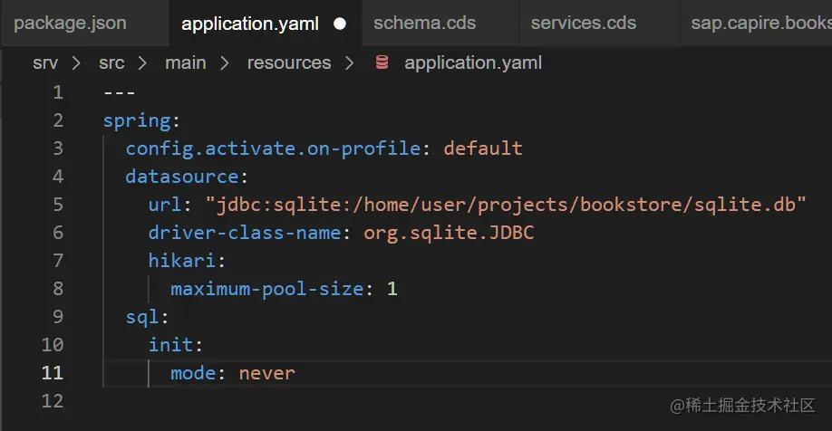 第 11 行设置成 never 的原因是因为我们已经用命令行 cds deploy --to sqlite 对数据库进行了初始化操作。