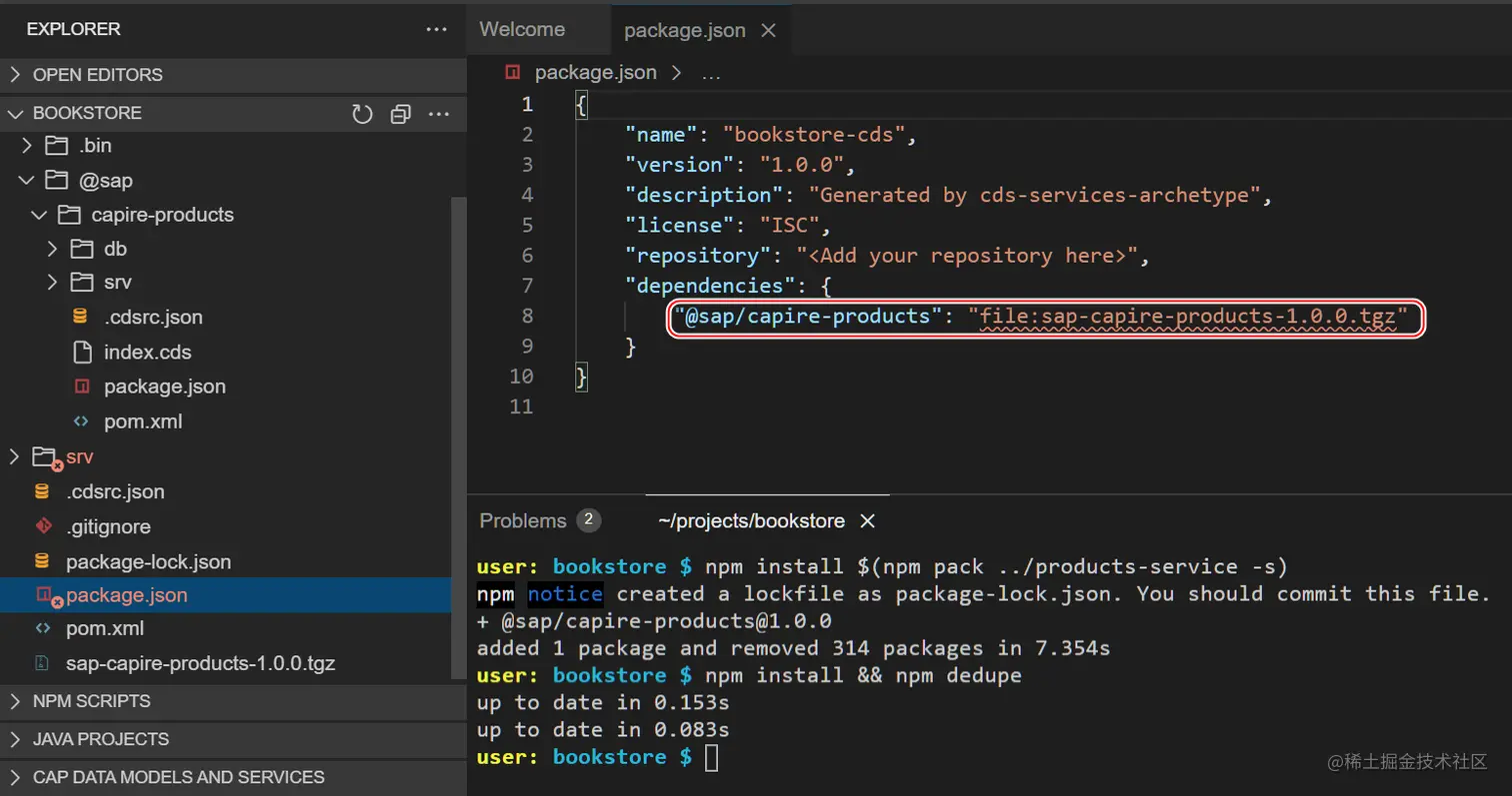 现在 bookstore 项目的 package.json 里,就能看到 products-service 项目的依赖了。