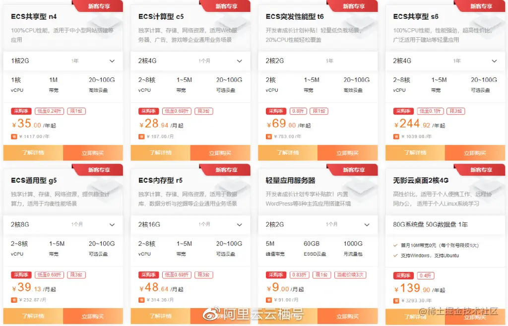 在选购云服务器时,我们要选择服务器的地域可用区、规格实例、操作系统、硬盘大小、带宽大小、安全组等配置。ECS共享型 n4、ECS突发性能型 t6等产品,新人用户一年只需要几十块就可以拥有。