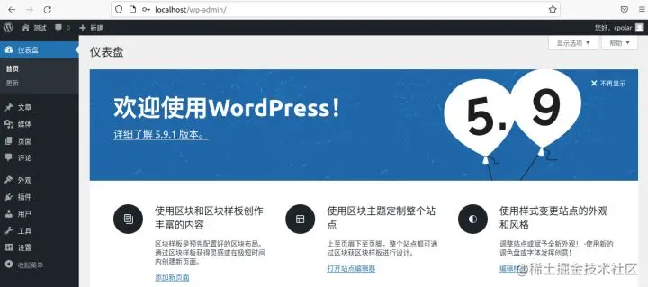 在完成这一系列的wordpress设置并保存,再次登录就能进入wordpress的主页面。