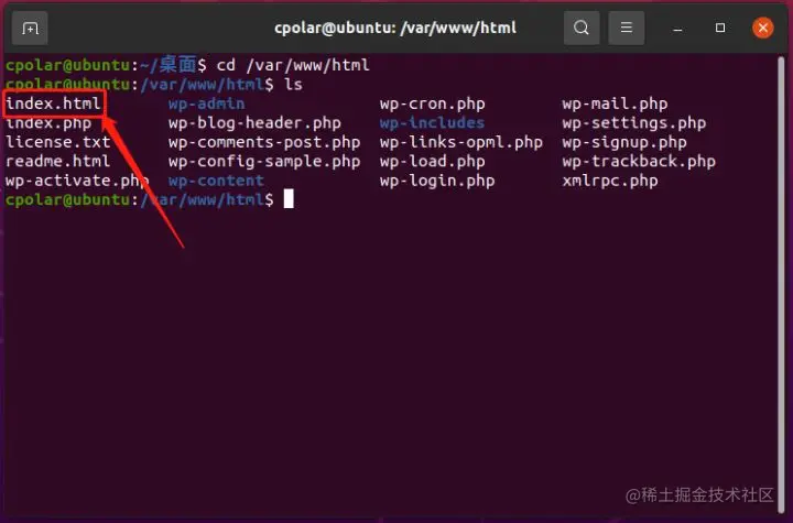 但奇怪的是,并没有出现我们预料中的wordpress语言设置界面,这时我们需要返回系统终端,输入命令“cd /var/www/html”,打开本地html目录,并输入“ls”命令,复查wordpress是否存入该目录下。