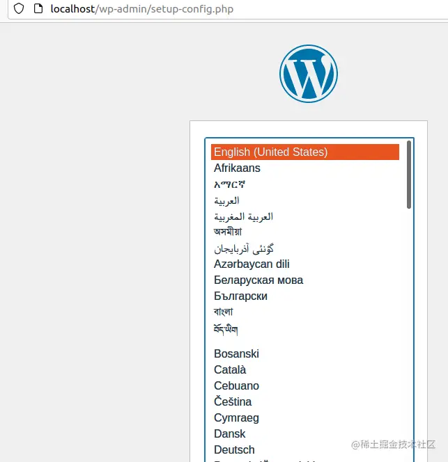 然后我们再次打开浏览器,输入地址localhost,此时我们就能看到熟悉的wordpress语言设置页面。