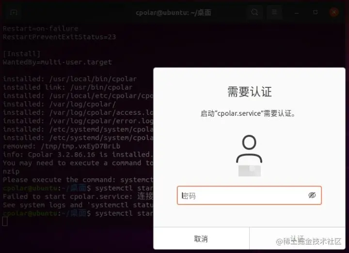 在输入命令后,Ubuntu系统会跳出要求输入密码的提示框。这里要注意的是, “systemctl”命令属于系统级命令,因此会要求输入Ubuntu系统的密码,而不是cpolar的账户密码(可能会有朋友问,窗口提示信息为启动cpolar.service需要认证,不就是输入cpolar客户端的密码吗?当然不是…因为我的Ubuntu系统名就命名为cpolar)。