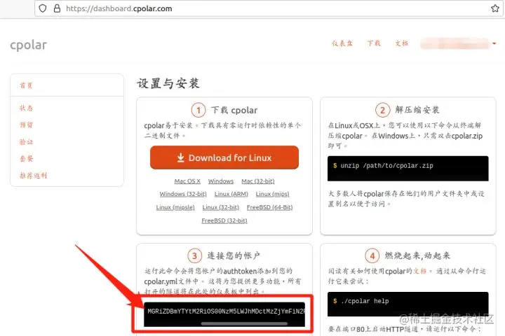 接着,我们就要输入cpolar的token码,即输入命令“cpolar authtoken XXXXXXXXXXX(其中XXXX部分即为下图中的token码,此码每个用户唯一,以保证数据安全)”,让cpolar客户端能正常工作。token码位于cpolar官网。