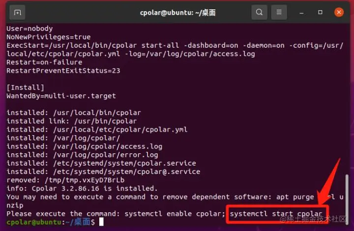 在cpolar安装完毕后,我们就可以根据cpolar安装文档的提示,输入命令“systemctl start cpolar”来启动本地的cpolar客户端。